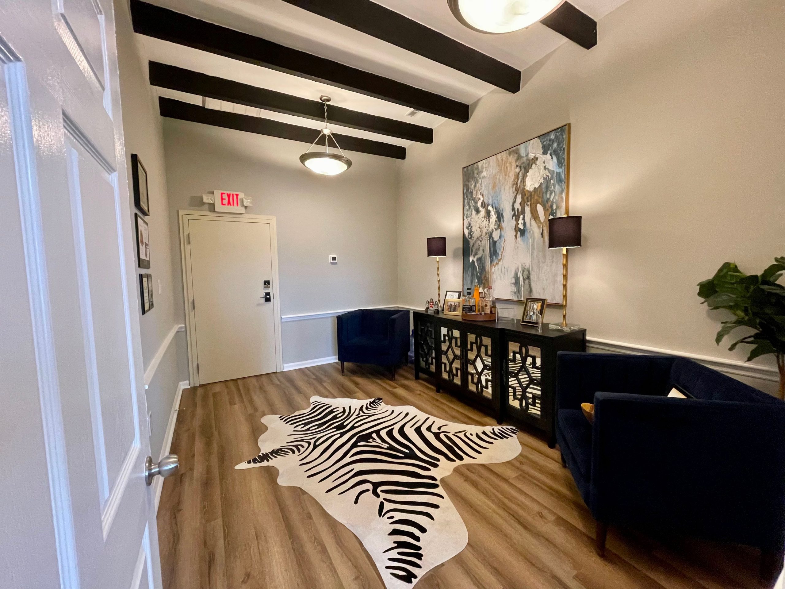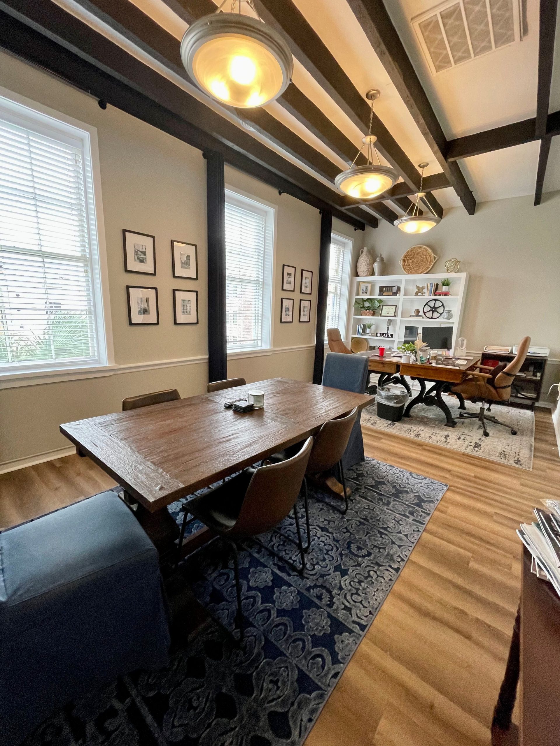 This office suite features a waiting/reception area, spacious private office with beautiful views from the large windows over East Bay St. of the U.S. Custom House, and another private office with storage. Located across from the elevator and easy for clients to find. Two parking passes available for $160 each per month in the garage located behind the building.